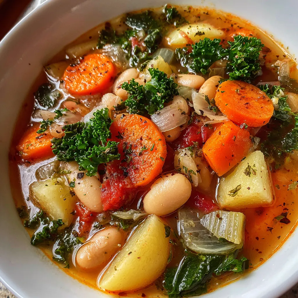 Warm yourself by the stove with this hearty stone soup, where creamy beans, sweet carrots, and vibrant kale mingle in a fragrant broth. Let each ladle deliver a taste of cozy country warmth and simple comfort.
