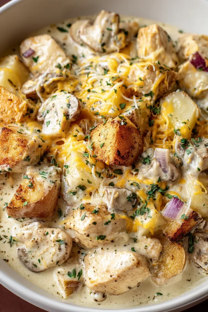 - Heavy cream: Contributes ultra-rich, silky texture that coats the chicken and potatoes in luxurious creaminess.