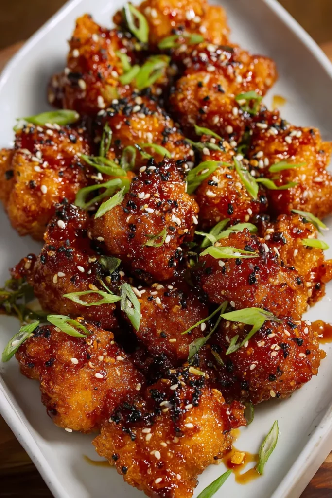 Transfer the chicken bites to a serving dish. Garnish with sesame seeds and sliced green onions.