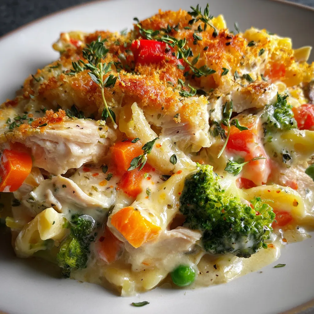 Tender chicken and vibrant vegetables nestle in a rich, creamy sauce, topped with melted cheese and crisp breadcrumbs. Each bite offers warmth, texture, and hearty flavor perfect for family dinners.