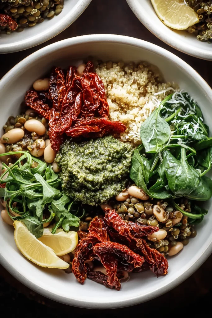 These vibrant bowls blend protein-rich quinoa, lentils, and creamy butter beans with zesty spinach pesto and sun-dried tomatoes. A satisfying meal full of flavor and nutrients!
