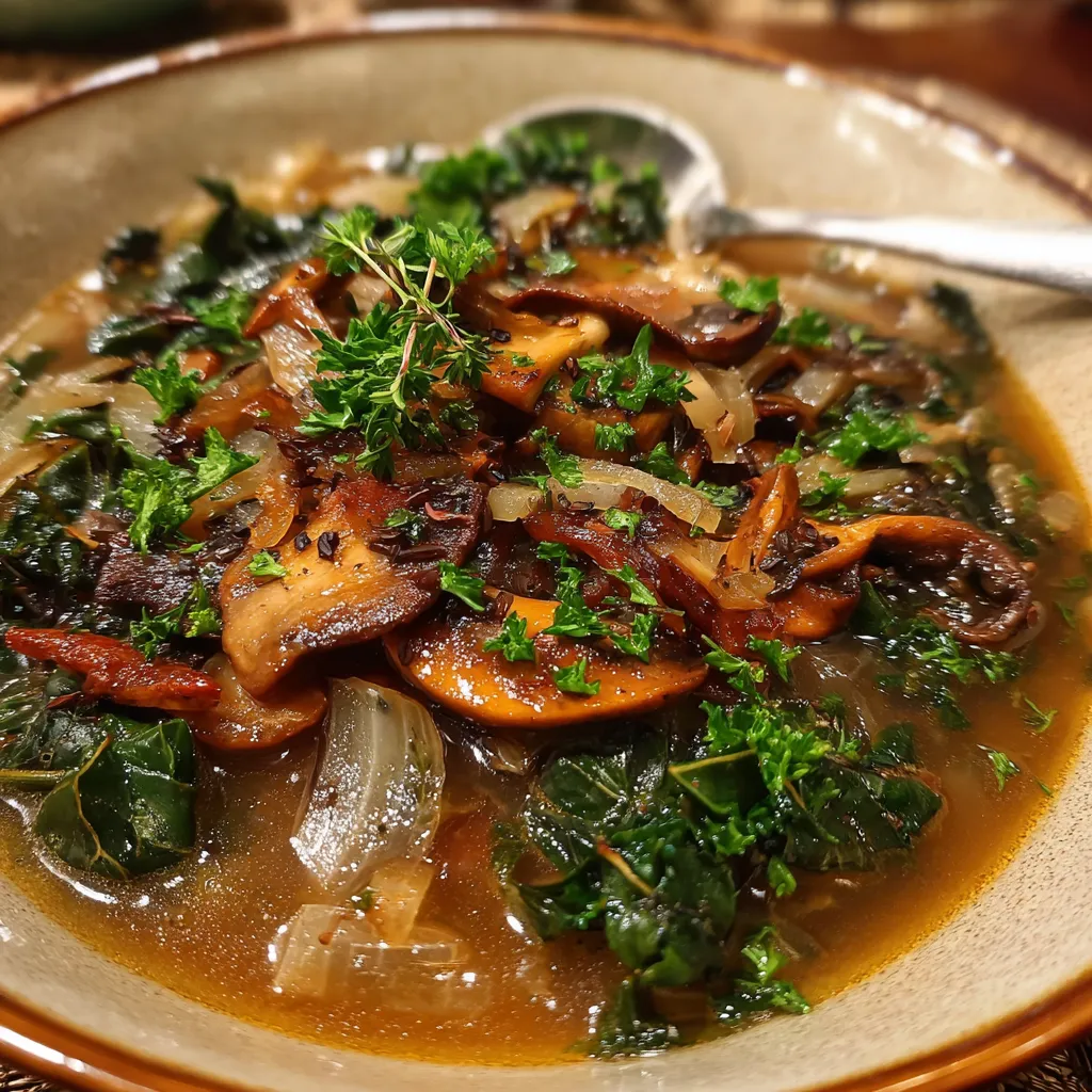 Earthy wild mushrooms mingle with sweet, golden onions in a cozy broth, punctuated by tender potatoes and peppery kale. A swirl of cream adds silkiness, while fragrant thyme and balsamic vinegar elevate each spoonful.